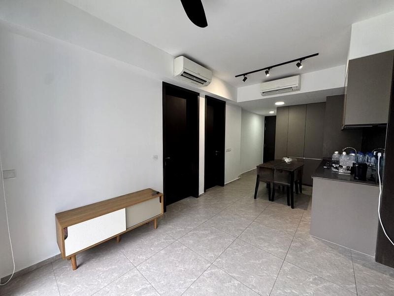 The unit features two well-appointed bedrooms, including a master suite with an en-suite bathroom that boasts a luxurious rain shower and a stylish wall-hung toilet. The kitchen is a chef's delight, equipped with track lighting, an integrated oven, and minimalist handle-less cabinets, perfect for entertaining. Thoughtful touches like built-in sliding wardrobes and ceiling fans enhance the functionality and aesthetic appeal of this home.