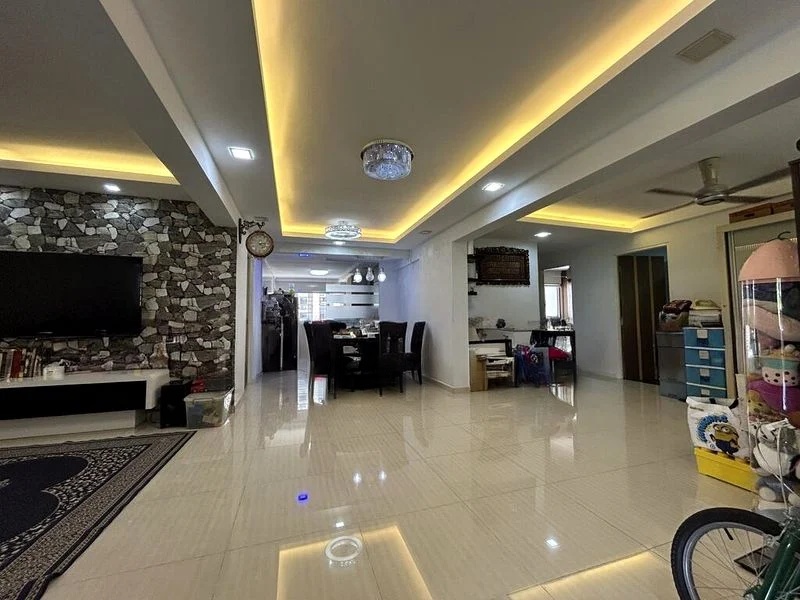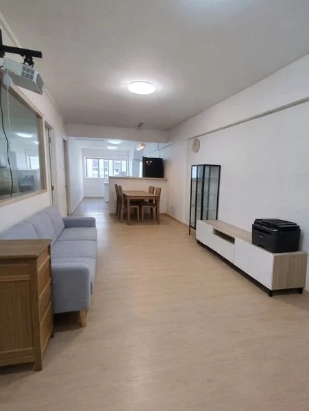 Step into a warm and inviting atmosphere in this well-maintained 5-room flat, where wood-look laminate flooring seamlessly connects the open-concept living and dining area. Large windows bathe the space in natural light, offering delightful views of the surrounding greenery and HDB estate. The cozy ambiance is further enhanced by decorative wooden doors and ceiling fans, creating a perfect retreat for relaxation.