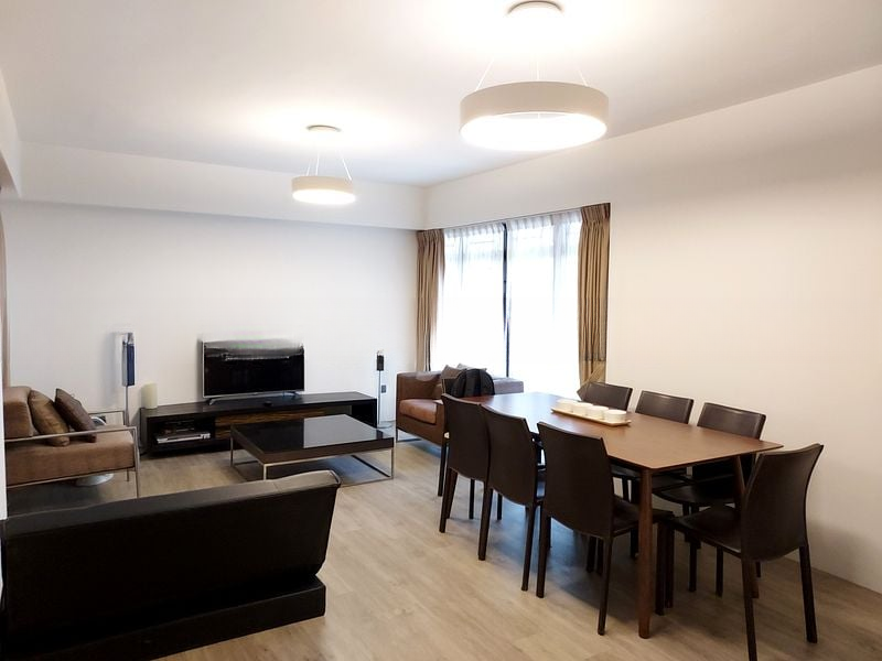 The unit features a thoughtfully designed layout, including a modern kitchen with dark wood-look cabinetry and a solid surface countertop, perfect for culinary enthusiasts. The spacious bedrooms come with a platform bed that offers ample storage, built-in wardrobes, and air conditioning for comfort. The bathrooms are functional yet stylish, showcasing tiled walls and louvred windows for ventilation.
