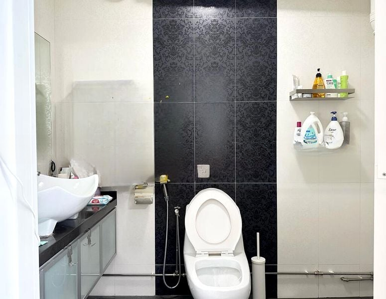 The well-maintained unit features a thoughtful layout with standout elements, including a stylish wooden TV console and a decorative sideboard in the hallway. The bedrooms are designed for comfort, with built-in storage solutions and a ceiling fan for added convenience. The bathrooms boast modern finishes, with a striking black patterned feature wall and a bidet spray for a touch of luxury.