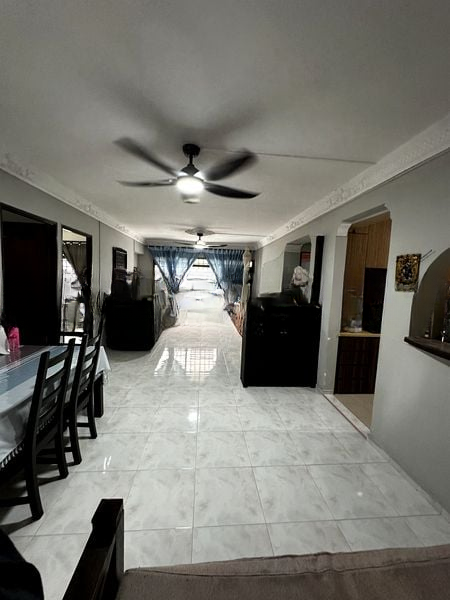 Step into this inviting 4-bedroom flat, where abundant natural light floods the spacious living area, highlighting the ornate ceiling molding and the warmth of the L-shaped leather sofa. Large windows draped with sheer curtains offer a serene view of the surrounding HDB blocks and lush greenery, creating a cozy ambiance that feels like home.