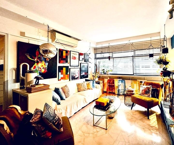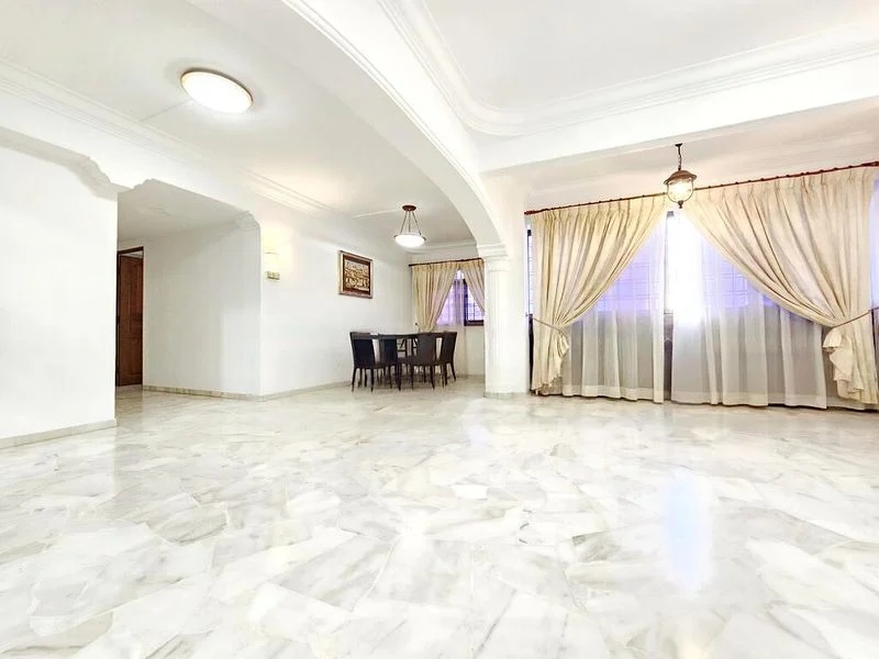 Step into this inviting 4-bedroom flat, where abundant natural light floods the spacious living area, highlighting the ornate ceiling molding and the warmth of the L-shaped leather sofa. Large windows draped with sheer curtains offer a serene view of the surrounding HDB blocks and lush greenery, creating a cozy ambiance that feels like home.
