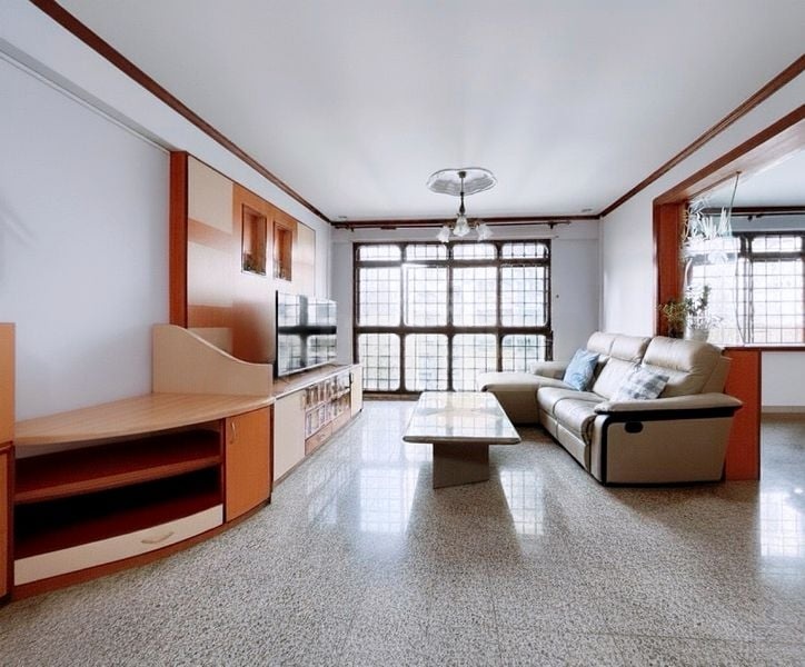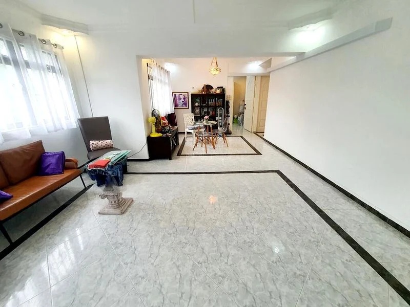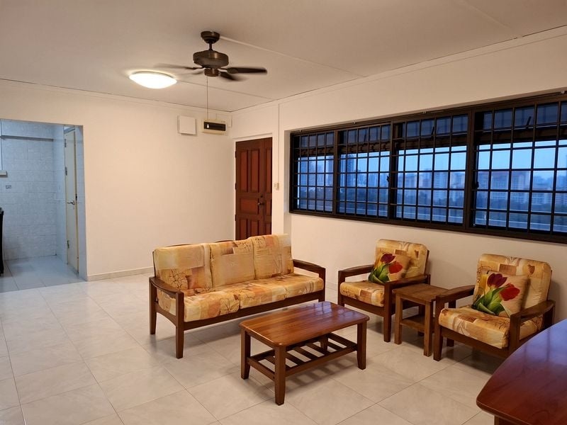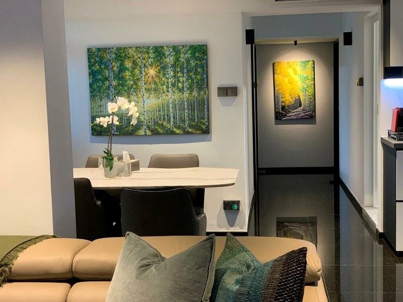 Step into this cozy HDB flat and be greeted by a stunning stone-patterned feature wall that adds character to the living room. The natural light pours in, illuminating the space while the black leather sofa and red curtains create a warm ambiance. From the balcony, enjoy an unblocked panoramic view of the swimming pool, lush greenery, and the distant city skyline, making every moment spent here feel like a retreat.