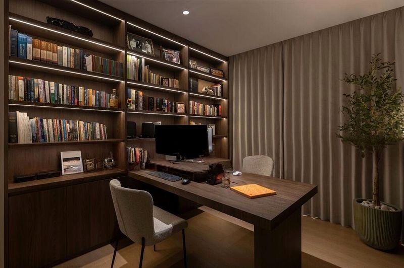 This thoughtfully designed 2-bedroom, 2-bathroom unit boasts standout features including a spacious living room, a contemporary kitchen equipped with built-in oven and induction cooktop, and a luxurious bathroom with a walk-in shower and glass partition. Each bedroom is adorned with wood-look flooring and large black-framed windows, ensuring a cozy yet stylish retreat. The integration of built-in wardrobes maximizes space while maintaining a sleek aesthetic.