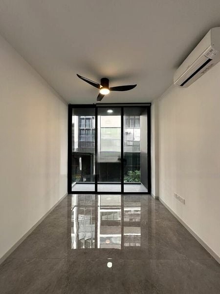Step into a world of modern elegance as you enter this brand-new condominium at The Essence. The abundant natural light floods through large sliding glass doors, illuminating the sleek grey marble-look floor tiles that extend throughout the living space. Enjoy serene views of greenery and neighboring buildings from the dual balconies, creating a tranquil ambiance that invites relaxation.