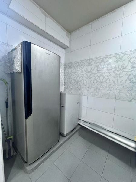 This efficient 3-room HDB flat boasts a well-planned layout, offering a master bedroom and a common bedroom, both equipped with built-in cabinetry for ample storage. The kitchen is designed for functionality with tiled walls showcasing a decorative pattern, and a dedicated space for your refrigerator and washing machine. The harmonious flow from the living area to the kitchen and service yard enhances the overall living experience.