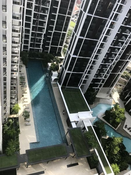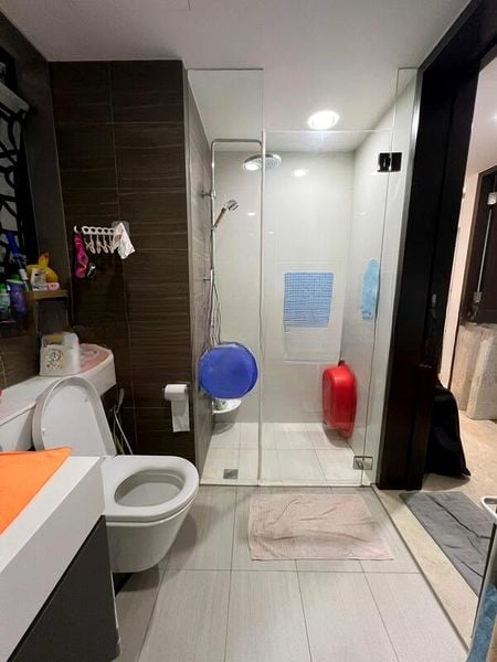 This well-maintained unit features polished tile flooring in the living room, complemented by a sleek leather sofa and a ceiling fan for added comfort. The bedroom boasts light wood flooring, a built-in wardrobe, and blackout blinds for restful nights. Step outside onto the balcony adorned with wooden decking, perfect for outdoor dining under the stars, enhanced by track lighting and a glass railing that frames the unblocked views of the cityscape and surrounding neighborhood.