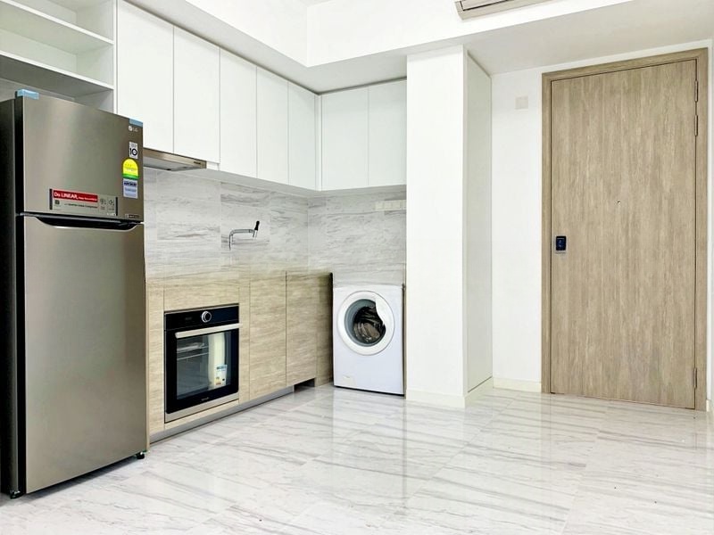 This 2-bedroom, 2-bathroom unit is thoughtfully designed for comfort and style. The master bedroom offers a tranquil retreat with wood-look laminate flooring and a built-in wardrobe, while the bathrooms are equipped with luxurious rain showers and contemporary fixtures. Enjoy the convenience of a digital door lock and air conditioning throughout, ensuring a perfect blend of functionality and aesthetics.