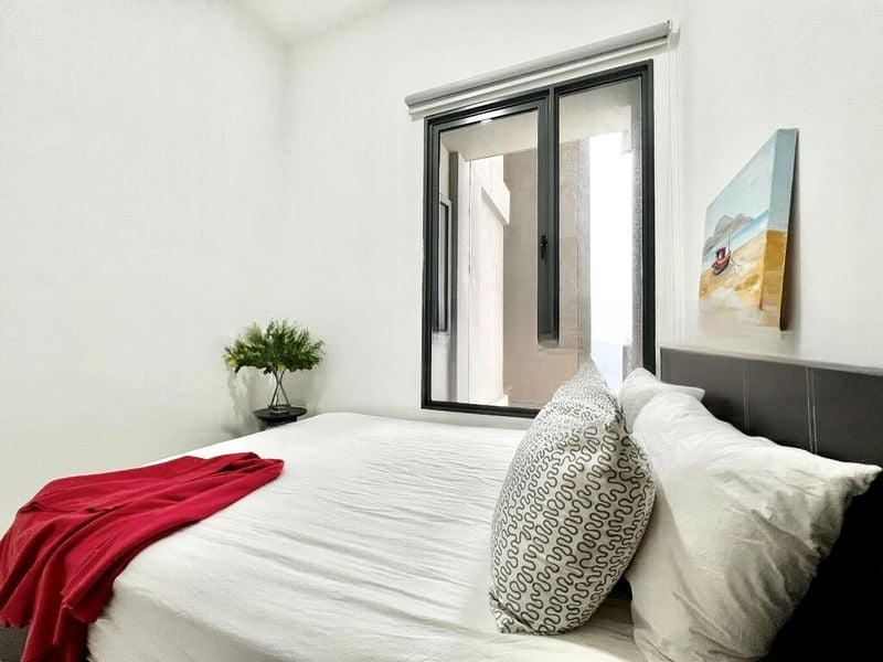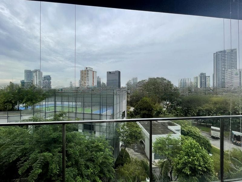 Step into a bright and airy oasis at Forte Suites, where abundant natural light floods the space through floor-to-ceiling windows, showcasing unblocked panoramic views of the city skyline and lush greenery. The polished floor tiles and marble-patterned finishes create a sophisticated ambiance, inviting you to relax and unwind in style.