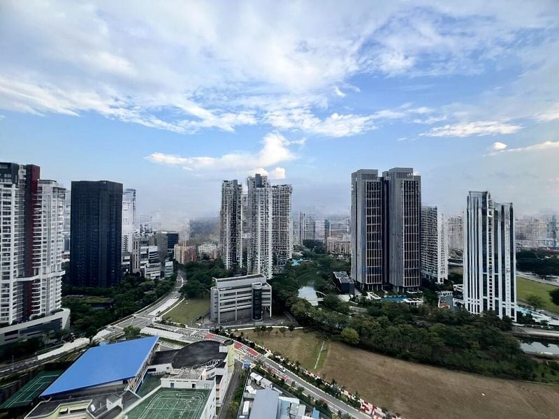Step into a world of elegance as you enter this stunning unit at Yong An Park. The bright and airy ambiance is complemented by abundant natural light streaming through large windows, offering captivating views of the city skyline. The polished tile flooring in the living room, paired with the ornate chandelier in the foyer, creates a welcoming atmosphere that invites you to explore further.