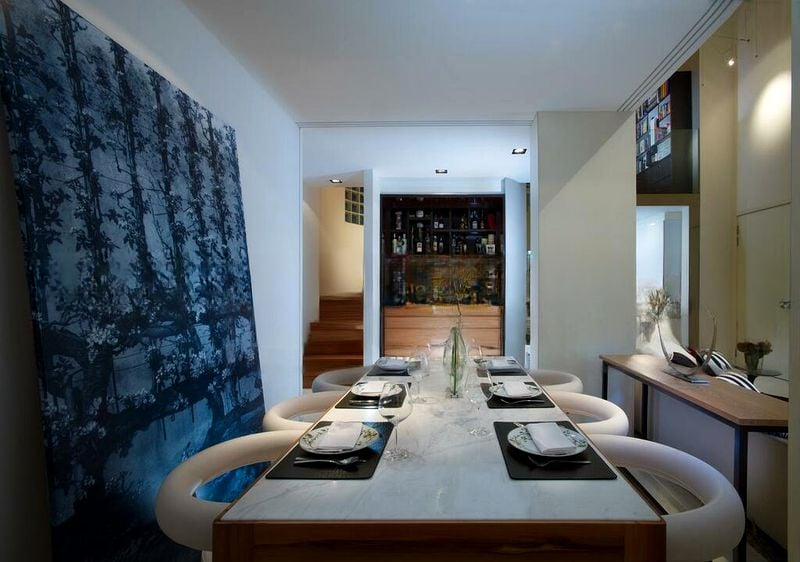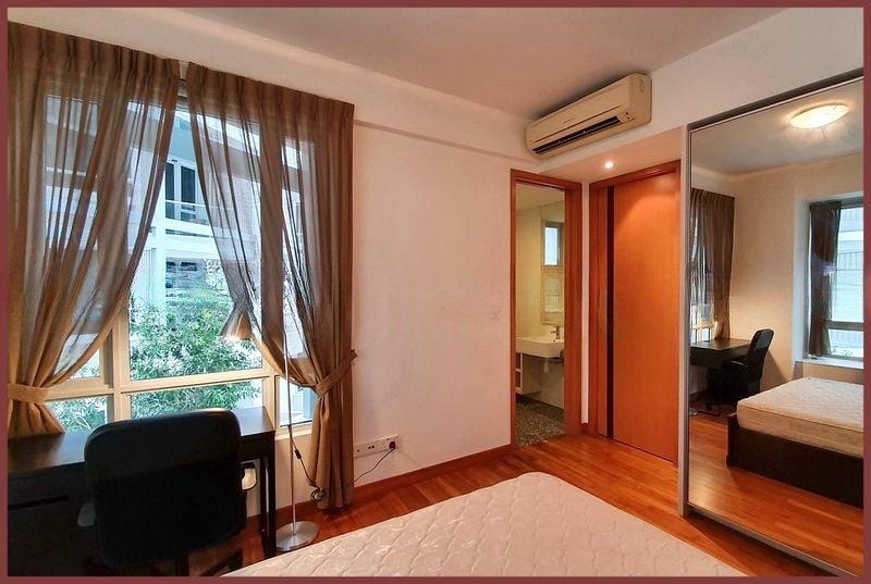 This efficient 2-bedroom, 2-bathroom layout maximizes utility with a dedicated storage room and a rare wet and dry kitchen configuration, perfect for culinary enthusiasts. The master bedroom features en-suite bathroom access and large windows offering serene greenery views, while the second bedroom doubles as a study with custom L-shaped wooden cabinetry. Every corner of this unit reflects quality and style, from the warm wood-tone flooring to the modern striped area rug in the living area.