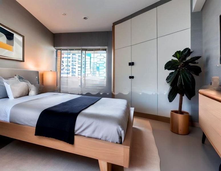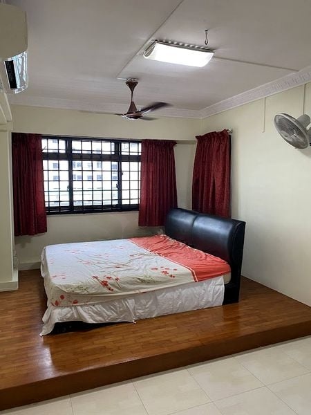 Step into this functional 3-bedroom flat where natural light gently fills the space, creating a warm and inviting ambiance. The original finishes, including a wood-look platform bed and dark red curtains, provide a classic touch, while the urban views of neighboring buildings remind you of the vibrant life outside.