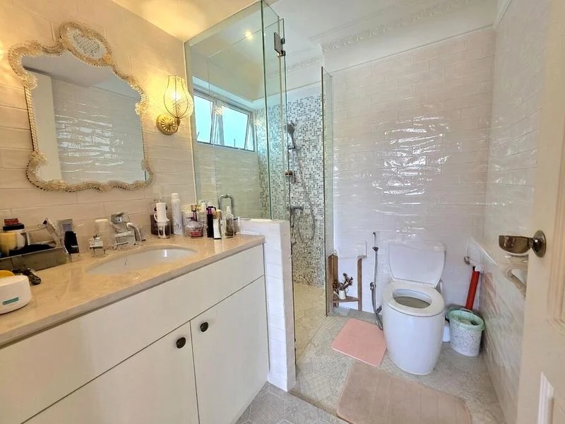 This unit boasts a well-thought-out layout with three spacious bedrooms, perfect for families. The bathroom features fully tiled walls and a convenient bidet spray, ensuring practicality in everyday living. The living area is complemented by ceiling fans and air conditioning, providing comfort year-round.
