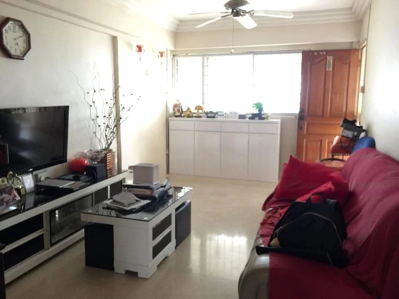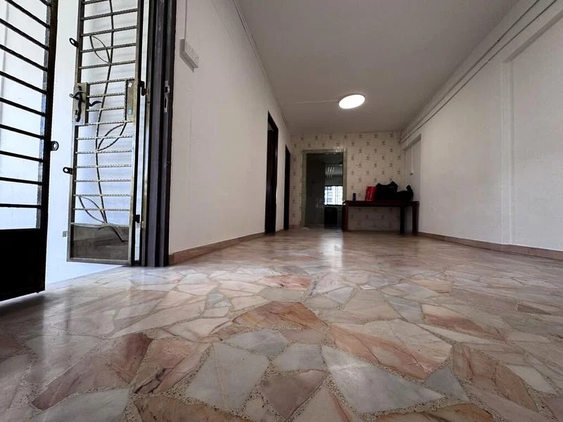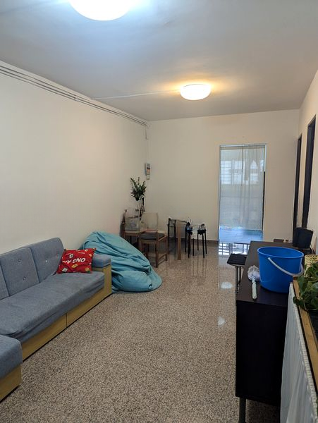 Step into this well-maintained 2-bedroom flat and feel the welcoming ambiance created by the simple yet functional design. The broken marble flooring glistens under the moderate natural light, while the white painted walls and ceiling fan enhance the airy feel of the living room. Enjoy views of the neighboring blocks, providing a sense of community and connection.