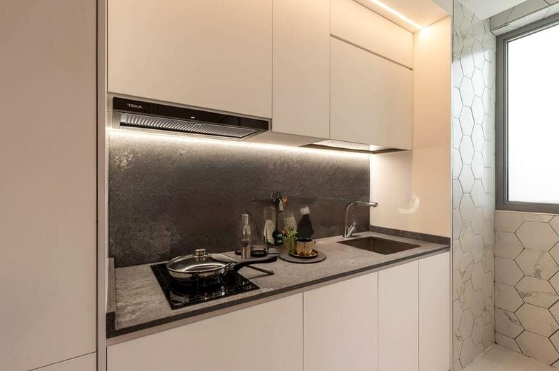 This thoughtfully designed layout features a spacious living room with a long wooden floating TV console and a cozy brown leather sofa, perfect for relaxation. The kitchen boasts a sleek dark stone backsplash and minimalist cabinetry, equipped with an induction hob and under-cabinet LED lighting. The master bedroom offers a serene retreat with floor-to-ceiling wardrobes and a marble-look headboard wall, while the versatile study area showcases a custom loft bed structure, ideal for both work and rest.