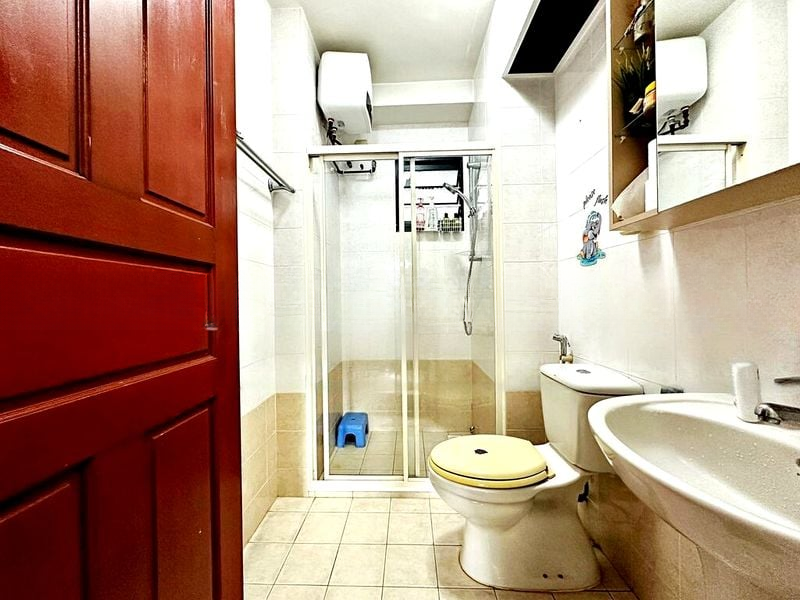 This well-maintained 3-bedroom unit features a modern layout that maximizes comfort and style. The dining room, highlighted by a striking lime green wall, flows seamlessly into a kitchen equipped with dual-tone cabinetry and a gas cooktop. Each bedroom boasts unique features, including a crystal chandelier and textured walls, ensuring a distinct personality for every space. The bathroom impresses with a glass vessel sink and monochrome patterned tiles, combining elegance with practicality.
