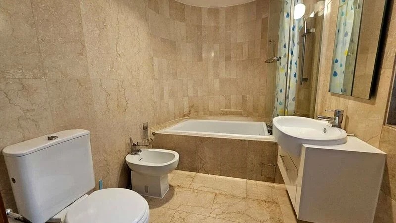 This spacious 4-bedroom, 4-bathroom layout features standout elements such as a double vanity with backlit mirrors in the bathrooms, a stunning marble dining table, and an island bar with elegant linear pendant lighting in the kitchen. The open-concept living area, complete with a stone-textured TV feature wall and recessed cove lighting, is perfect for entertaining or relaxing with family. Each room is thoughtfully designed with modern furnishings, including integrated dark wood cabinetry and minimalist decor, ensuring a seamless blend of style and functionality.