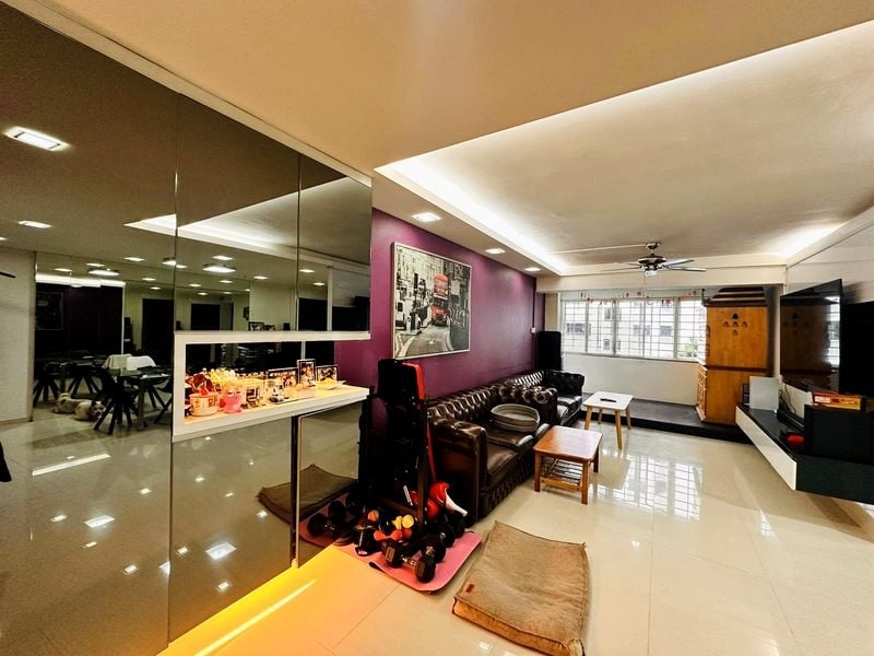 This well-maintained 3-bedroom flat boasts a full renovation with standout features including a U-shaped kitchen equipped with built-in appliances, two-tone cabinetry, and a large black refrigerator. The living room is perfect for relaxation, while the study/gaming room, adorned with a white brick feature wall, offers a versatile space for work or play. Each bedroom is designed for comfort, featuring textured wallpaper and sheer curtains that allow for privacy without sacrificing light.