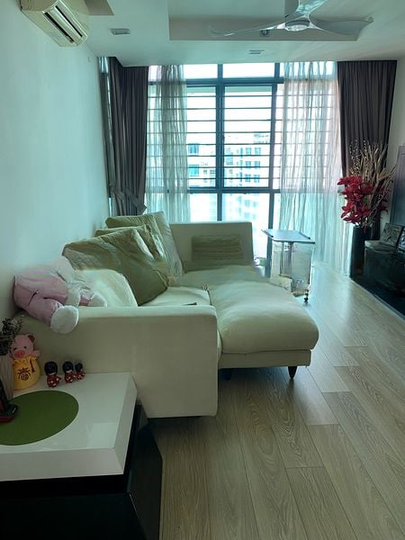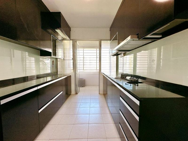 Step into a warm and inviting atmosphere as you enter this well-maintained 3-bedroom flat at 299 Punggol Ctrl. The cozy living room, adorned with feature wallpaper and a ceiling fan, is bathed in natural light from the large window, creating a perfect space for relaxation or entertaining. The galley kitchen, featuring sleek grey and white cabinetry and a spacious layout, is ideal for culinary enthusiasts.