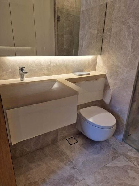 This one-bedroom unit boasts a well-thought-out layout, featuring a spacious living area with large format floor tiles that seamlessly flow into the bedroom, adorned with wood-look flooring and a large window. The bathroom is a true highlight, showcasing luxurious marble-look finishes, a rain shower, and a wall-hung toilet, all complemented by an integrated vanity sink and a large mirror that reflects the modern aesthetic.