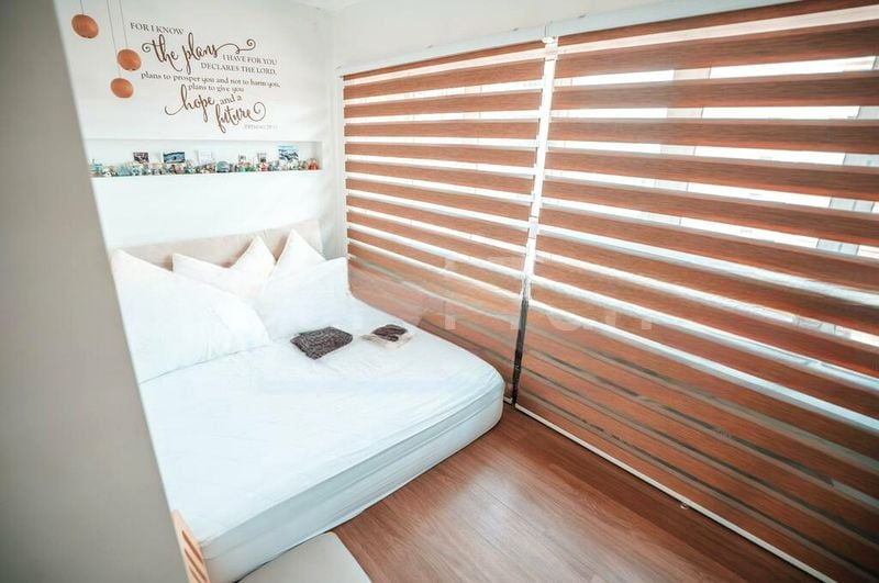 Step into this vibrant 2-bedroom flat and be greeted by an eclectic ambiance that exudes character. The bold yellow accent walls in the living room complement the white tiled flooring, creating a warm and inviting atmosphere. Natural light filters through the window grilles, enhancing the space's lively feel, while the curved false ceiling design adds a touch of modern elegance.