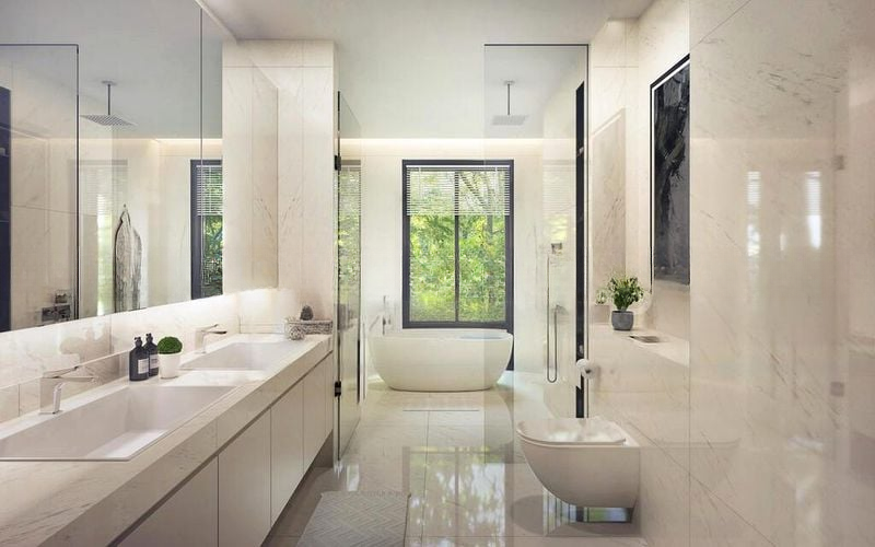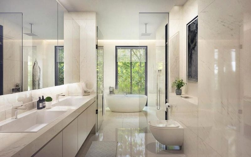 Step into a realm of modern luxury where abundant natural light floods through floor-to-ceiling windows, illuminating the exquisite marble finishes and designer furnishings throughout this brand-new home. The open-concept living area, adorned with high ceilings and elegant glass partitions, offers breathtaking views of lush greenery and the vibrant city skyline, creating an ambiance that is both serene and sophisticated.