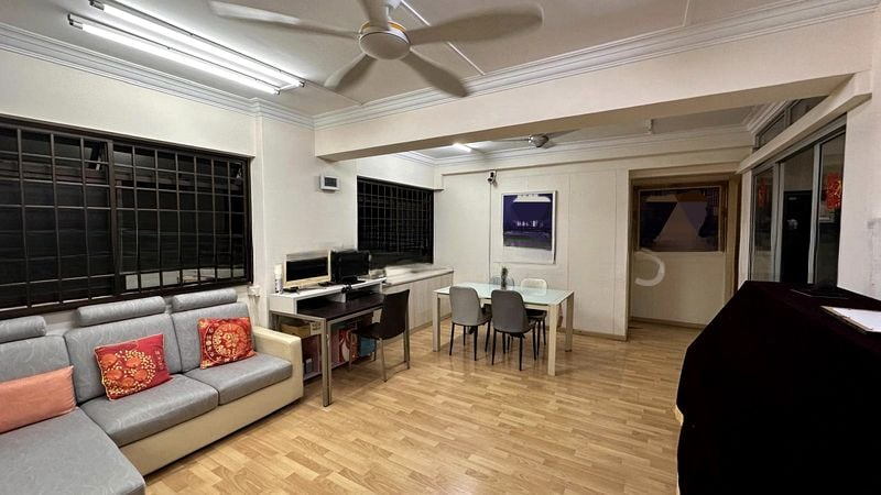 Step into this inviting 3-bedroom HDB unit, where a warm ambiance greets you with its cozy wood-look laminate flooring and decorative ceiling cornices. Natural light filters through, enhancing the views of lush greenery and the urban landscape beyond, creating a serene retreat in the heart of Singapore.