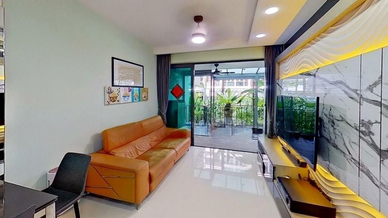 Step into a bright and airy sanctuary at Esparina Residences, where abundant natural light floods the space, highlighting the exquisite marble-look TV feature wall with LED backlighting. The polished tile flooring and recessed lighting create an inviting ambiance, while the balcony offers serene views of lush greenery, perfect for unwinding after a long day.