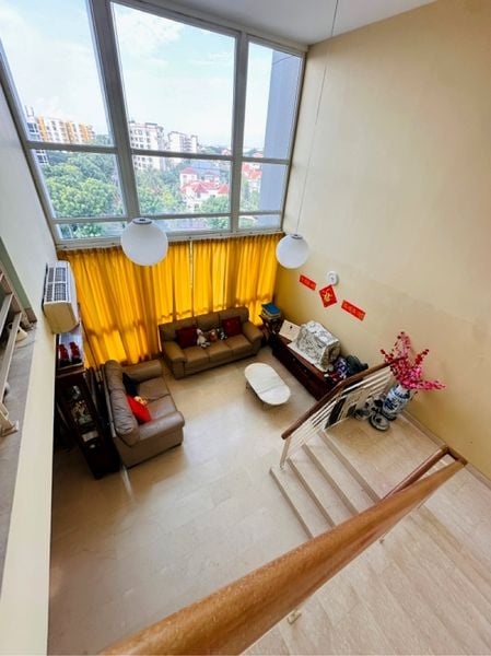 Step into a serene sanctuary at Changi Rise Condominium, where abundant natural light floods through large floor-to-ceiling windows, creating a warm and inviting ambiance. The modern minimalist design is accentuated by polished stone flooring and a tasteful glass block feature wall, offering an urban view that enhances the living experience.