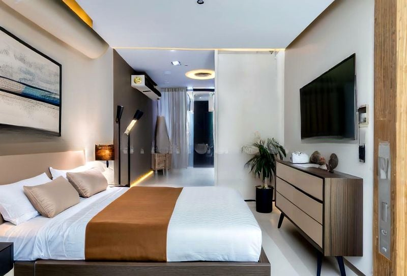 Step into a world of modern luxury as you enter this exquisite 5-bedroom unit at NYON. The high ceilings and marble flooring create an expansive ambiance, while designer display shelving and integrated cabinet lighting enhance the contemporary feel. Large windows invite natural light, offering serene views of lush greenery that perfectly complement the sophisticated interior.