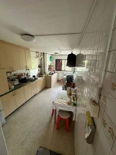 Step into a warm and inviting atmosphere as you enter this charming HDB flat, where traditional floral floor tiles set a nostalgic tone throughout. The living room, bathed in functional light, features a cozy sofa and TV area, complemented by a ceiling fan that enhances the lived-in ambiance.