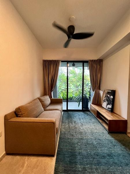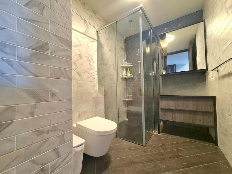 Step into a world of modern elegance as you enter this beautifully designed 1-bedroom unit at Mayfair Modern. The abundant natural light floods through large sliding glass doors, illuminating the marble-look porcelain flooring and highlighting the sleek finishes throughout. Enjoy serene views of lush greenery from your balcony workspace, complete with interlocking wooden deck tiles and artificial turf, creating a perfect blend of nature and comfort.