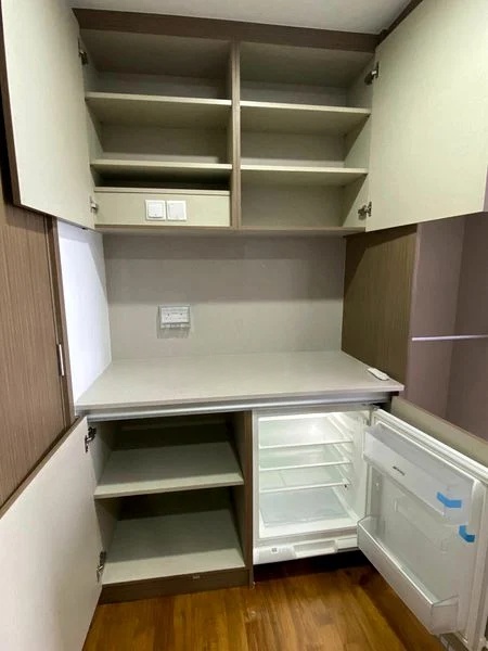 The well-maintained unit features an efficient layout with a kitchenette equipped with built-in wood-look cabinets, an integrated mini-fridge, and open shelving for convenience. The bathroom boasts a modern glass-enclosed shower and a stylish vanity with recessed lighting, while the bedroom offers a ceiling fan and a built-in sliding wardrobe with internal drawers for ample storage. The polished tiles in the utility area complement the overall aesthetic, ensuring a cohesive living experience.