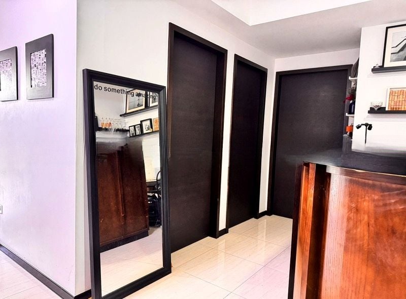 This well-maintained 2-bedroom condominium features an open concept layout, seamlessly connecting the living room and kitchen. The stylish kitchen boasts dark wood-grain cabinetry, white countertops, and a built-in oven, perfect for culinary enthusiasts. Relax in the living area with an L-shaped leather sofa, or step out onto the balcony for a breath of fresh air. The bathroom is a sanctuary with a rain shower and modern vanity, ensuring comfort and style.