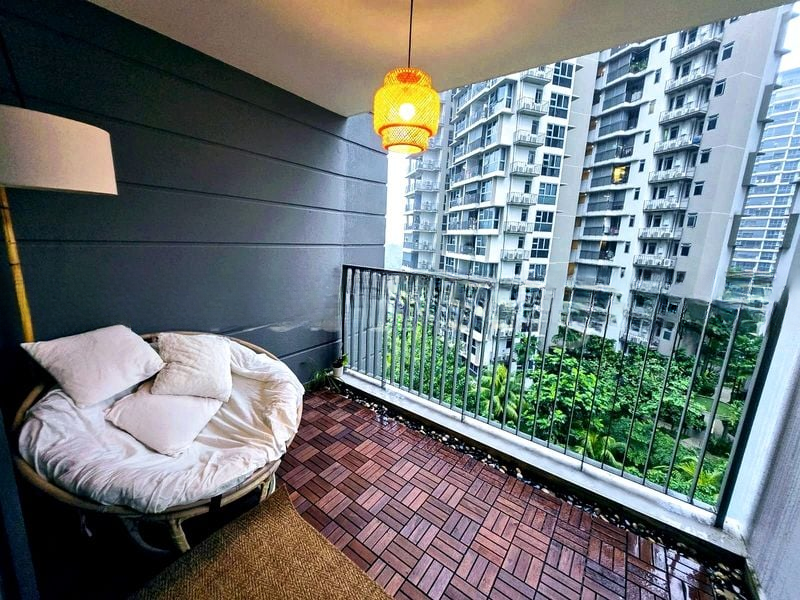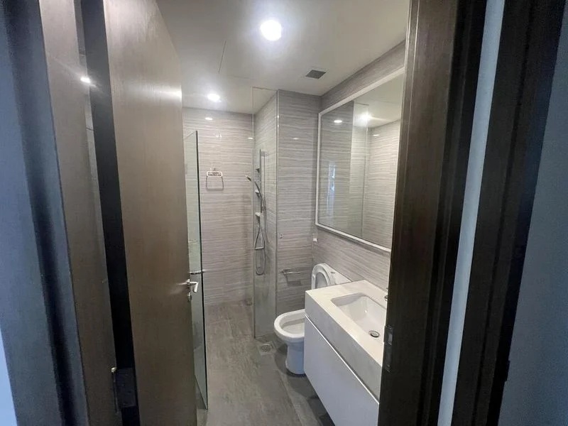 This 3-bedroom, 3-bathroom unit boasts standout features such as a custom floor-to-ceiling display cabinet and a marble-look TV feature wall, both enhanced by recessed LED strips. The kitchen is a chef's dream, equipped with high-gloss cabinetry, a built-in oven, and a sleek dining area adorned with modern glass pendant lighting. A dedicated study with custom shelving and integrated lighting offers the perfect work-from-home setup.