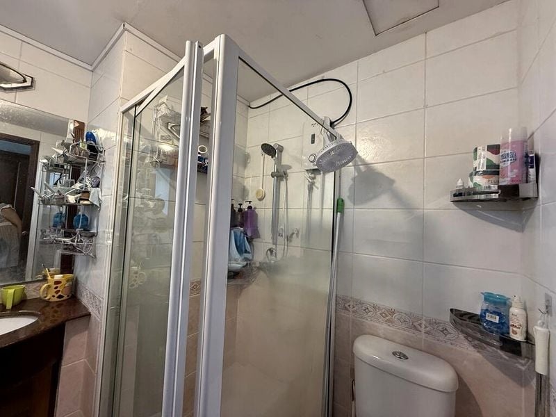 This well-designed 3-bedroom condo boasts an open-concept living and dining area, perfect for entertaining. The kitchen features L-shaped wooden cabinetry and black countertops, while the bedrooms are adorned with parquet flooring and extensive built-in cabinetry. The master bedroom, with its corner windows and recessed lighting, offers a serene retreat, complemented by a modern bathroom with a glass shower enclosure and decorative tiled walls.