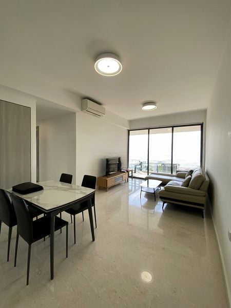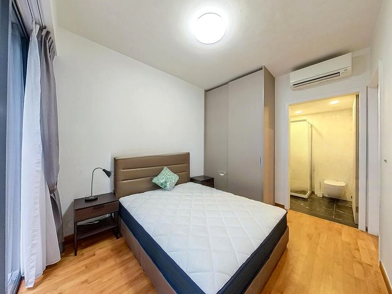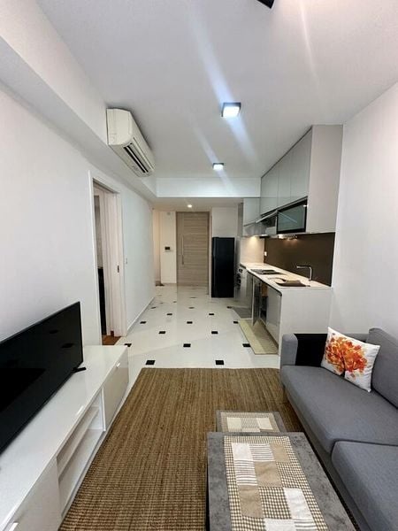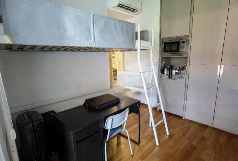 This well-maintained 2-bedroom, 2-bathroom unit features a standout loft bed with an integrated study desk, perfect for maximizing space. The living room boasts an L-shaped sofa and stylish black-accented tiled flooring, while the kitchen is equipped with integrated appliances and sleek white cabinetry. Step out onto the balcony, designed for outdoor dining, where you can unwind and enjoy the fresh air.