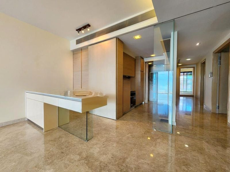 Step into a world of elegance as you enter this designer unit at The Azure. The moment you walk in, you are greeted by a stunning foyer adorned with a large abstract painting and wood-paneled walls, setting the tone for the luxurious ambiance throughout. Natural light filters through the expansive living room, showcasing the ornate furniture and breathtaking sea views framed by palm trees and greenery. The marble flooring and recessed lighting enhance the refined atmosphere, making it an inviting space for relaxation and entertainment.