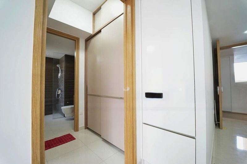 Step into a bright and airy sanctuary where natural light floods through floor-to-ceiling sliding doors, illuminating the polished tile flooring. The inviting ambiance is complemented by a charming bay window in the master bedroom, offering serene views of lush greenery, creating a peaceful retreat from the bustling city.