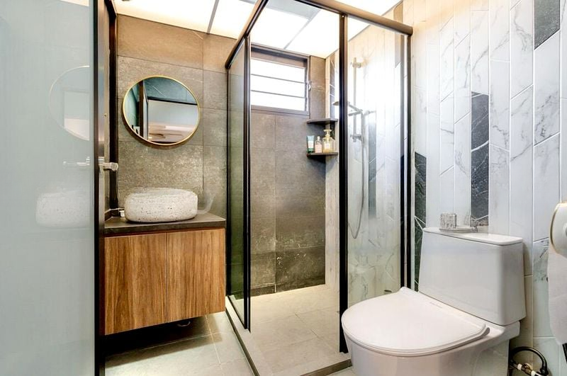 This well-maintained flat features standout rooms including a master bedroom with floor-to-ceiling built-in wardrobes and warm accent lighting, and a second bedroom adorned with a light blue accent wall and large windows. The bathrooms are equally impressive, showcasing floating vanities and mirrored cabinets with under-lighting, while the efficient layout includes a dedicated service yard and household shelter, ensuring practicality alongside style.