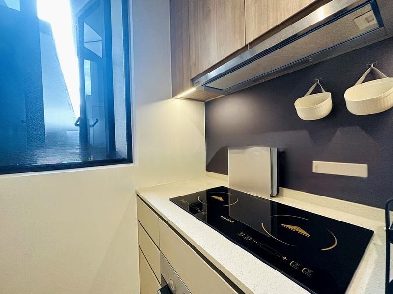 This well-maintained unit features a stylish dining area with a marble-top table, a fully-equipped kitchen with light wood cabinetry and a breakfast bar, and a luxurious bathroom boasting grey marble-look tiles and a floating vanity. The study area, complete with a workstation setup and large window, offers a perfect space for productivity. Every detail, from the integrated vanity lighting to the glass shower partition, has been thoughtfully curated for contemporary living.
