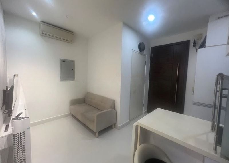 Step into this well-maintained open-plan studio at SMART SUITES, where you are greeted by a functional ambiance and a bright living area illuminated by overhead lighting. The compact layout seamlessly integrates the living, dining, and bedroom spaces, accentuated by a striking red feature wall that adds a touch of warmth to the environment.