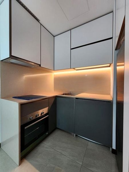 This thoughtfully designed 2-bedroom unit features an L-shaped kitchen equipped with integrated appliances, including an induction hob and oven, complemented by stylish two-tone cabinetry and under-cabinet LED lighting. The bathroom boasts elegant marble-look tiles and a luxurious rain shower, while the spacious living area provides access to the balcony, perfect for unwinding after a long day. With built-in floor-to-ceiling wardrobes and ample storage throughout, this home is both functional and aesthetically pleasing.
