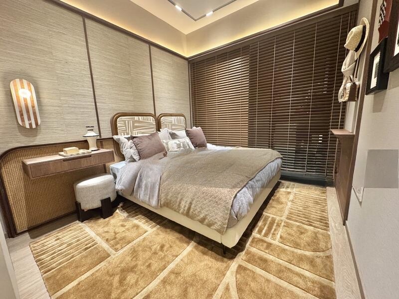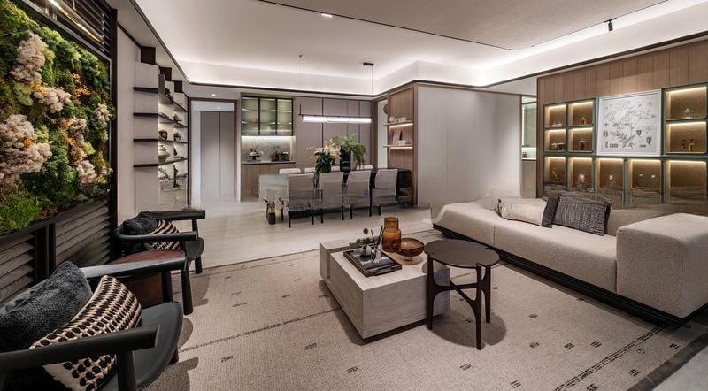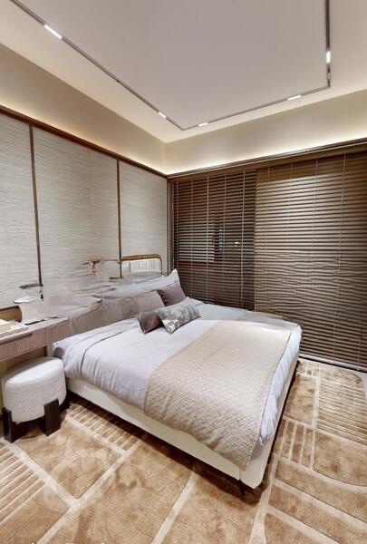 This exquisite unit features a spacious layout with four well-appointed bedrooms and three bathrooms. The dining area boasts an impressive 8-seater black marble table, complemented by a designer linear pendant light and built-in display cabinets with warm LED lighting. The kitchen is a culinary delight, showcasing light wood cabinetry and a stunning marble backsplash, seamlessly integrating functionality with style. A showflat gallery with an architectural scale model and interactive digital displays adds a unique touch to this luxurious living experience.