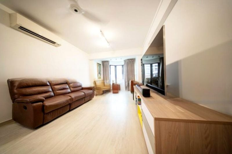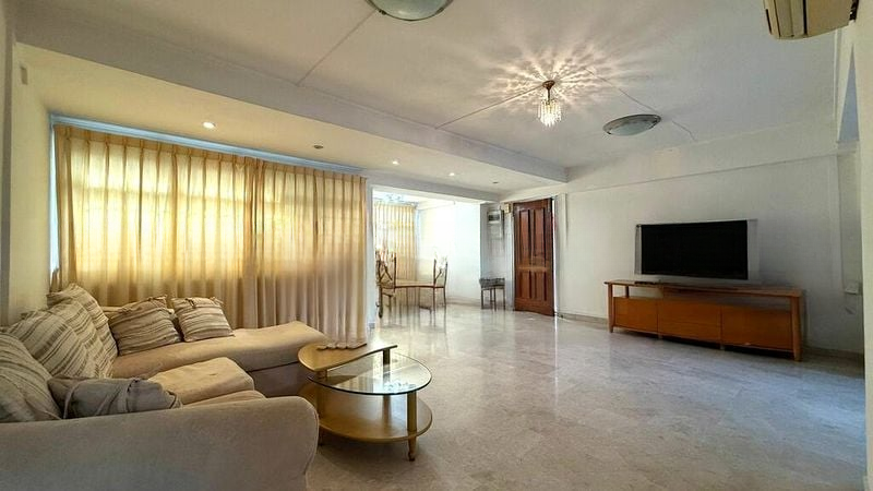 Step into this generously sized HDB flat and be greeted by the timeless elegance of marble-look tiled flooring that flows seamlessly throughout the spacious living and dining area. Although the natural light is limited, the functional layout creates a warm and inviting ambiance, perfect for family gatherings or quiet evenings at home.