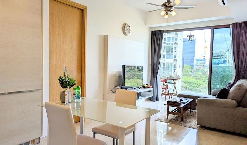 Step into a sanctuary of modern minimalist design, where abundant natural light floods the open-concept living area, creating an inviting atmosphere. The seamless flow from the living room to the balcony offers breathtaking views of the infinity pool, lush greenery, and the vibrant city skyline, making every moment spent here a visual delight.