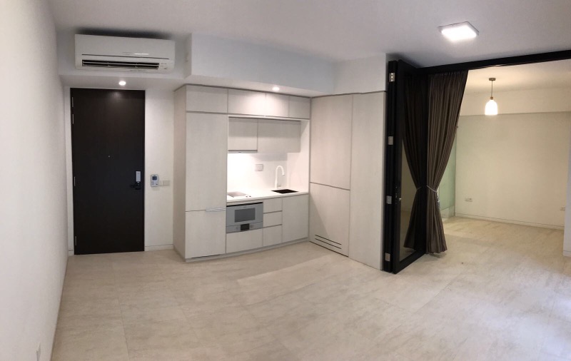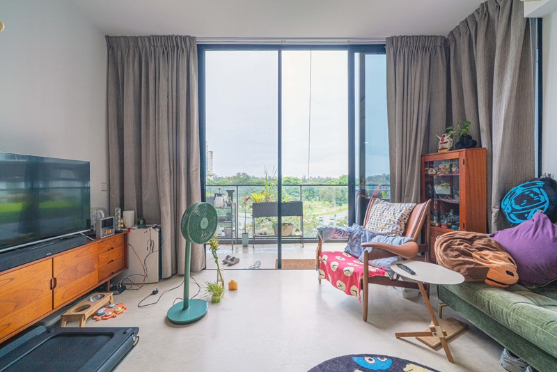 Step into this beautifully maintained high-floor unit at FULCRUM, where abundant natural light floods the space through floor-to-ceiling windows, creating a warm and inviting ambiance. The cozy living room, adorned with a green velvet sofa and a character-themed rug, seamlessly connects to a balcony that offers unobstructed views of lush greenery and the city skyline.