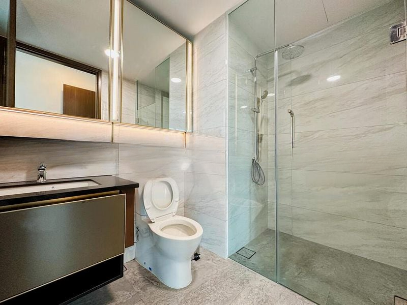 Step into a world of modern elegance as you enter this beautifully designed loft unit at Normanton Park. Bathed in abundant natural light, the space features floor-to-ceiling windows that frame breathtaking views of the city skyline and lush greenery. The minimalist ambiance is enhanced by a marble-patterned feature wall and geometric accent wall, creating a sophisticated yet inviting atmosphere.