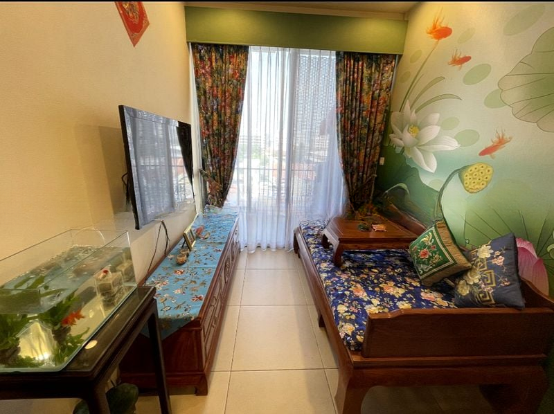 Step into a beautifully maintained unit at Avant Residences, where eclectic charm meets traditional elegance. The moment you enter, you are greeted by the warm ambiance created by large floral murals and traditional Chinese-style daybeds, bathed in moderate natural light that enhances the inviting atmosphere.