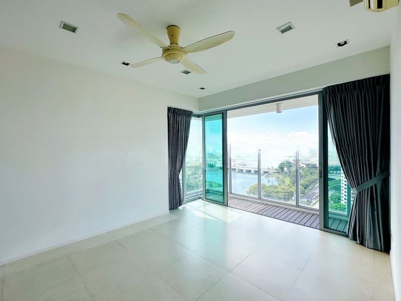 Step into a bright and airy sanctuary where floor-to-ceiling windows frame unobstructed views of the river, Singapore Sports Hub, and the city skyline. The ambiance is inviting, enhanced by the natural light that floods the space, creating a warm and welcoming atmosphere. The balcony, with its glass railing, offers a perfect spot to unwind while soaking in the panoramic scenery.
